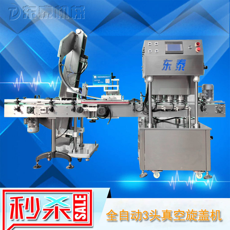 該直線式真空旋蓋機(jī)是東泰機(jī)械結(jié)合用戶使用的情況,摒棄了傳統(tǒng)轉(zhuǎn)盤式真空旋蓋機(jī)的弊端,研制開發(fā)的新型高效設(shè)備,設(shè)備自動檢測到兩個瓶子蓋子進(jìn)入到雙頭真空旋蓋機(jī)內(nèi),旋蓋機(jī)彩色顯示屏?xí)崟r顯現(xiàn)旋蓋狀況,整機(jī)多點檢測,當(dāng)進(jìn)口無瓶無蓋、出口堵塞、定位不準(zhǔn)、瓶身傾倒均自動停機(jī)。單個旋蓋頭達(dá)到的真空度都可以單顯示,單調(diào)整