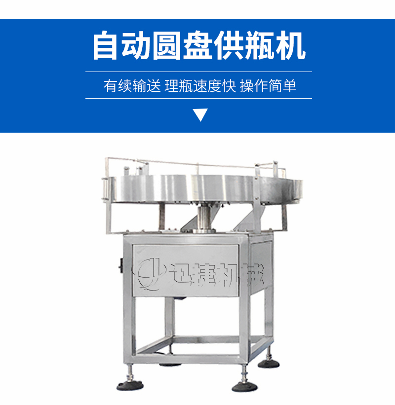 該圓盤供瓶機(jī)理瓶機(jī)是由人工將瓶子放入圓形轉(zhuǎn)盤上,轉(zhuǎn)盤轉(zhuǎn)動將瓶子有續(xù)撥入輸送帶,進(jìn)入灌裝機(jī)進(jìn)行灌裝。使用方便,噪音小,理瓶速度快,操作簡單是不可缺少的一個(gè)環(huán)節(jié)。