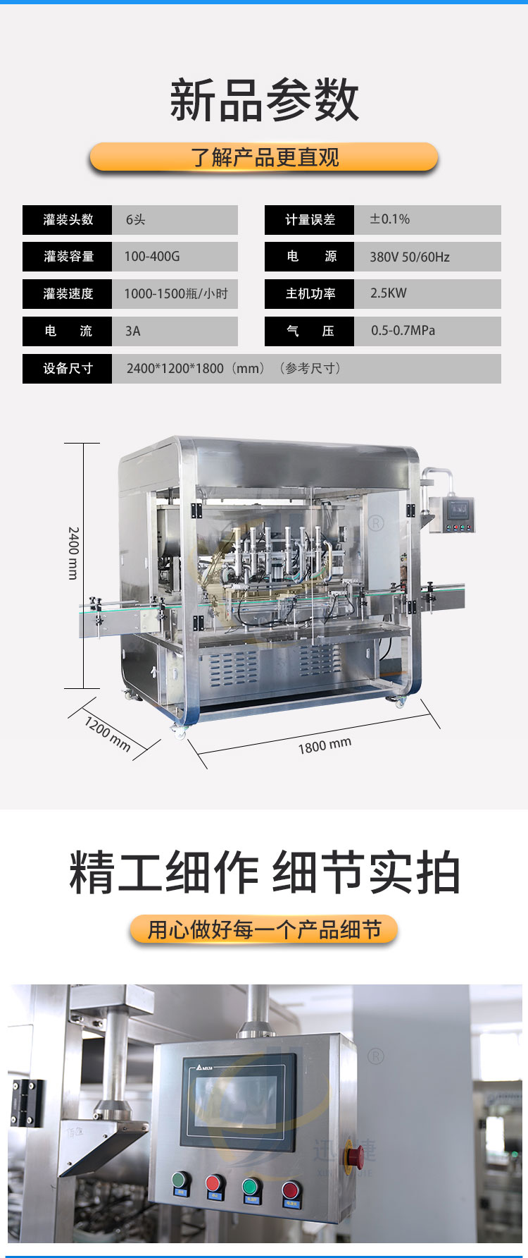 辣椒醬灌裝機采用活塞式灌裝原理,適用于調(diào)味品中帶顆粒并且濃度較大的辣椒醬、豆瓣醬、花生醬、香菇醬、果醬、牛油火鍋底料。