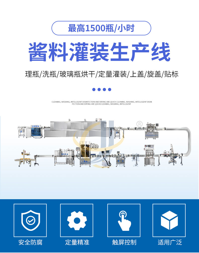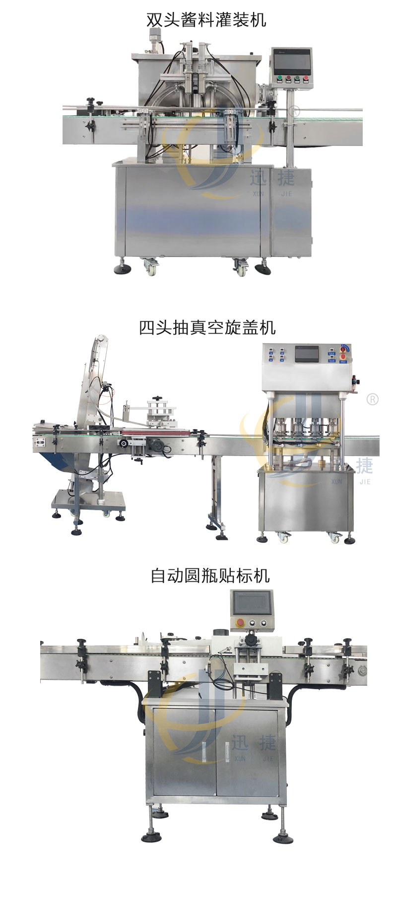 辣椒醬灌裝生產(chǎn)線適合市面上多種醬料包裝,如有油辣椒、海鮮醬、牛肉醬、香菇醬等的灌裝。適用于圓瓶或者六棱瓶。
