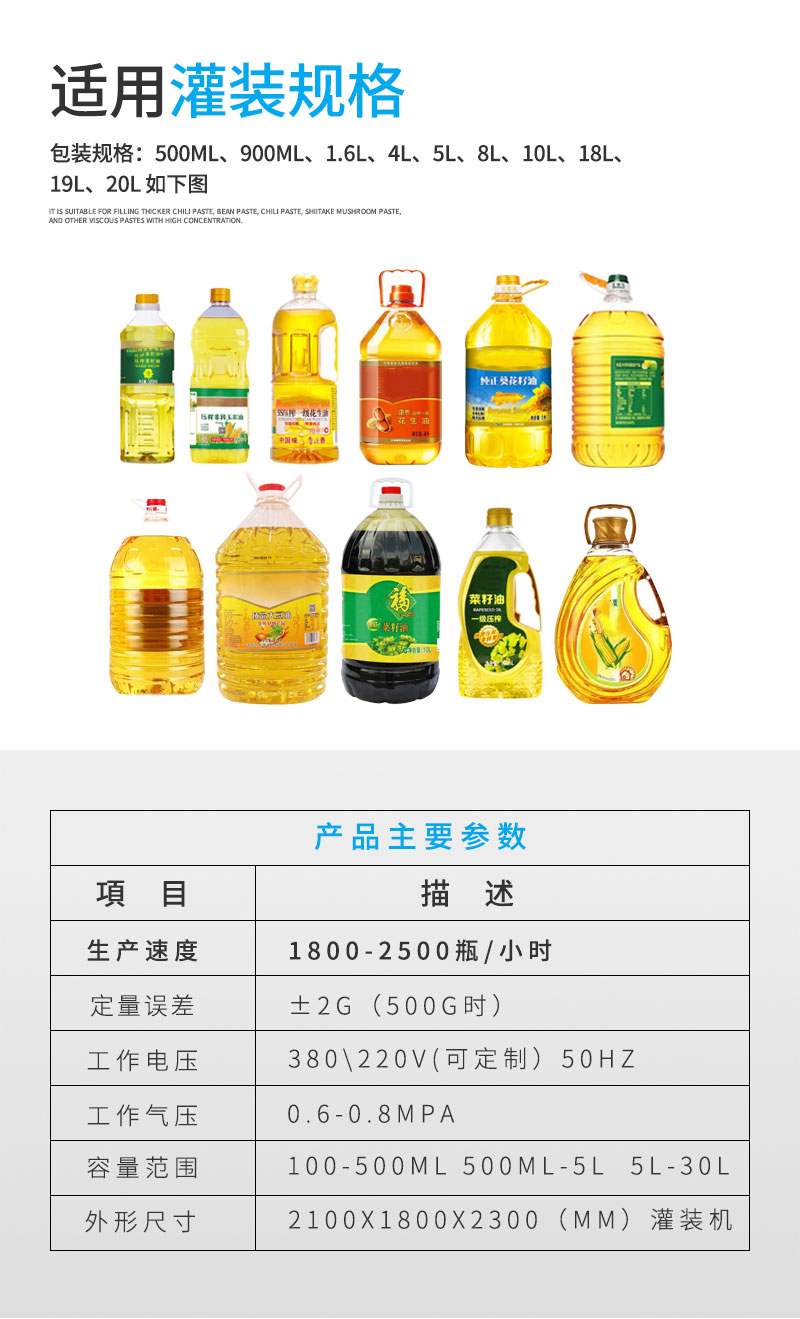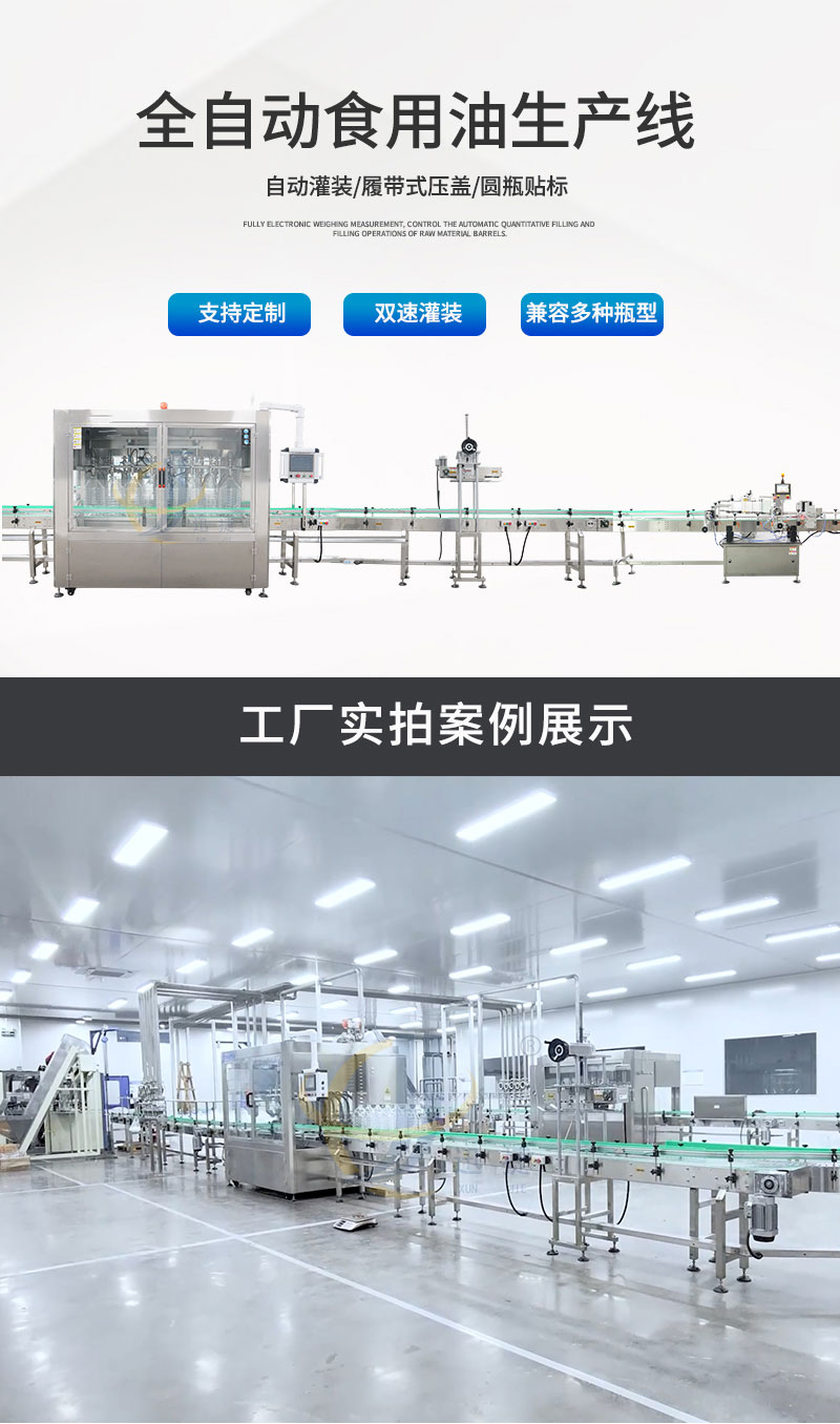 全自動(dòng)食用油灌裝生產(chǎn)線根據(jù)用戶需求非標(biāo)定制,灌裝部分為八頭灌裝機(jī),適用于不同瓶子的灌裝,配備壓蓋機(jī)和貼標(biāo)機(jī),自動(dòng)化程度高。