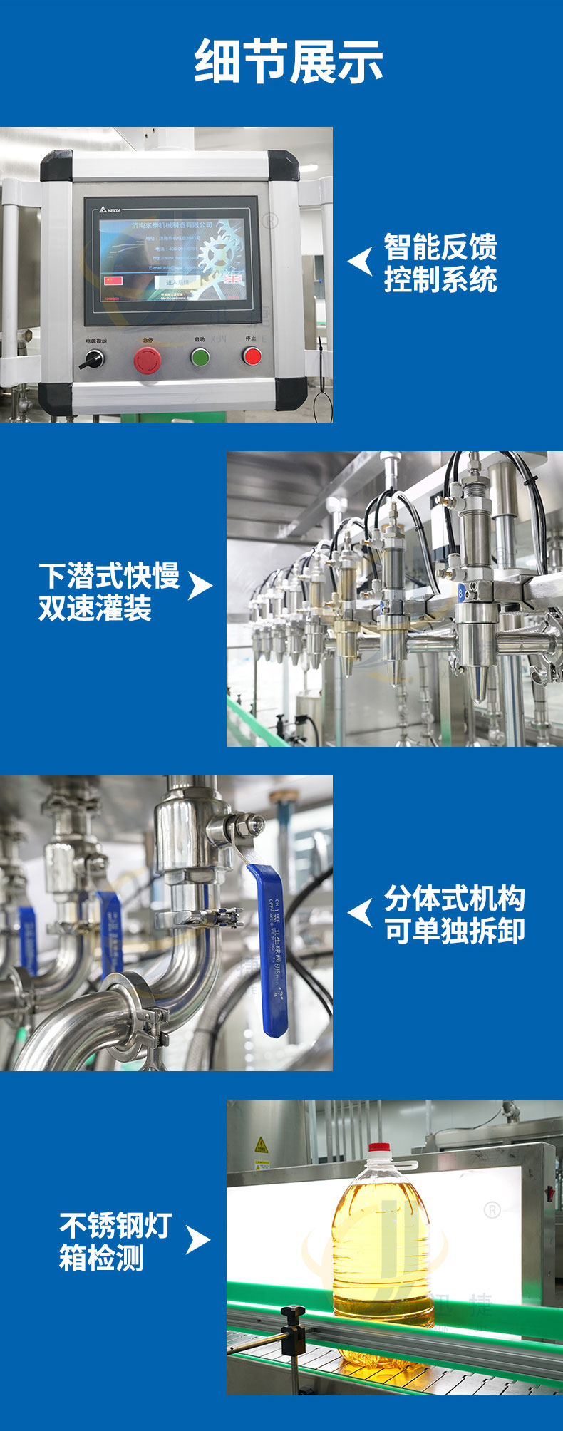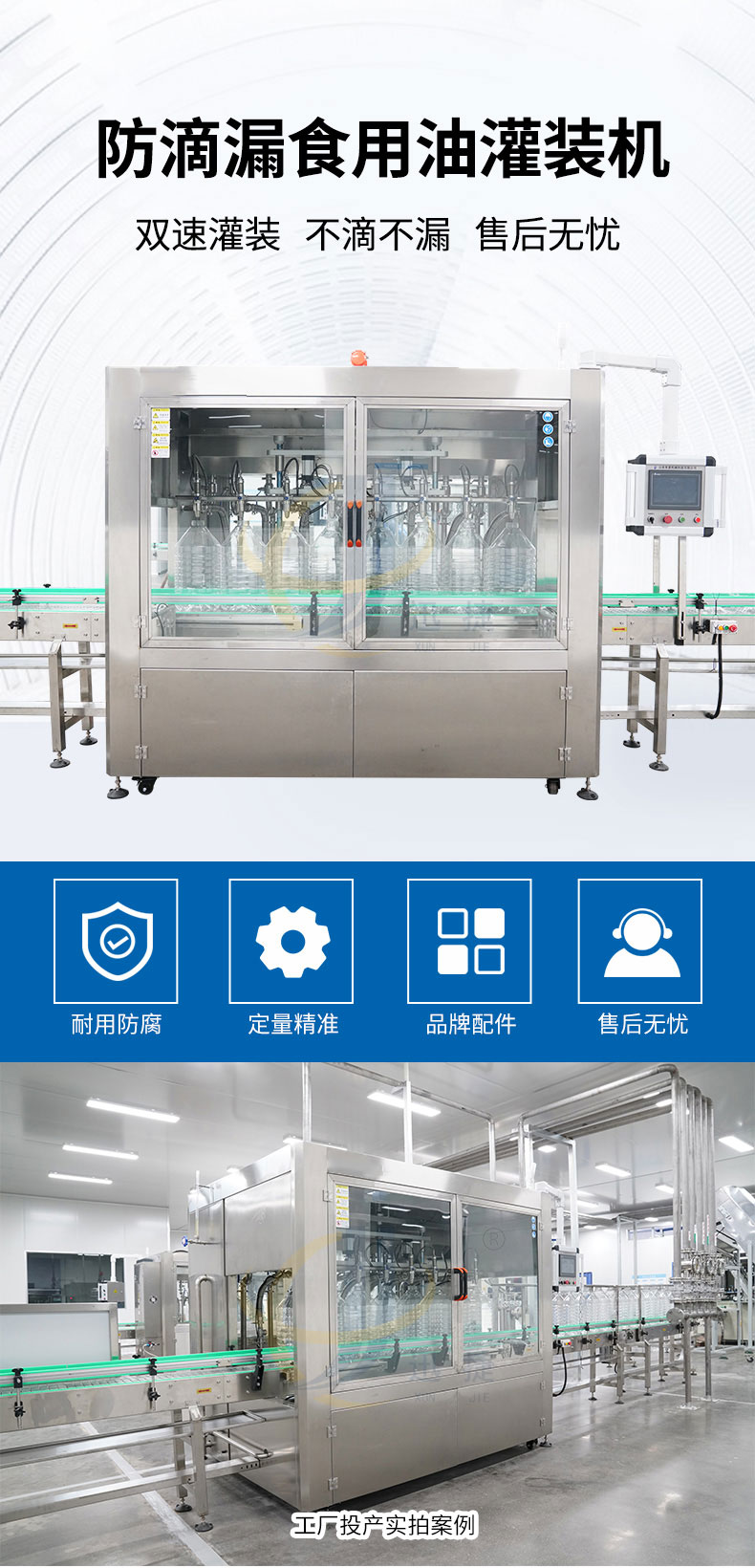 全自動八頭食用油灌裝機單頭單泵單變頻控制,容積和質(zhì)量兩種計量方式自由轉換,灌裝調(diào)節(jié)方便快捷。
