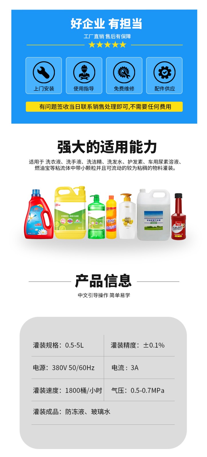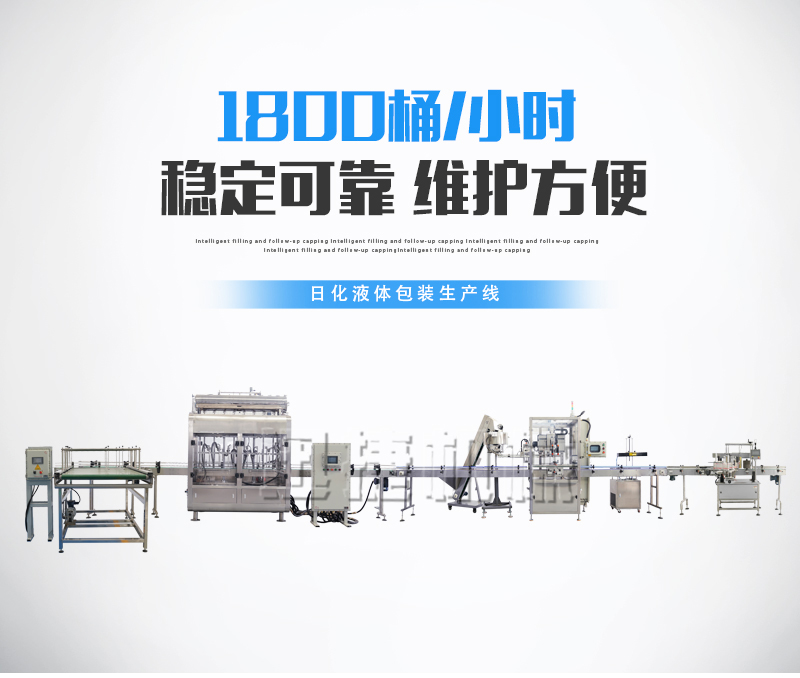日化液體包裝生產(chǎn)線適用于洗衣液、洗手液、洗潔精、燃油寶等粘流體中帶小顆粒并且可流動的較為粘稠的物料灌裝。
