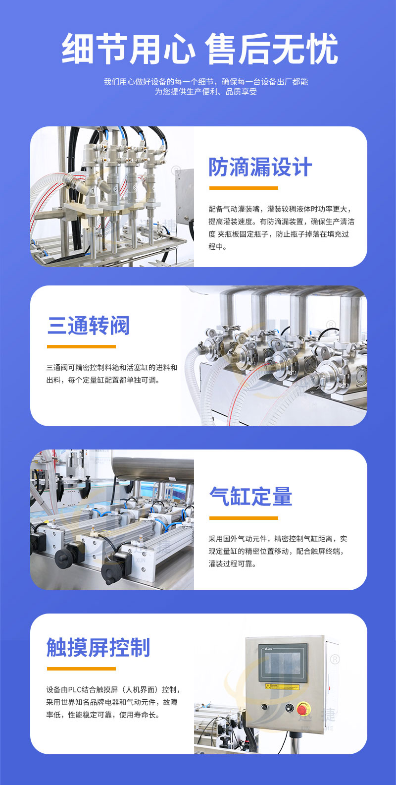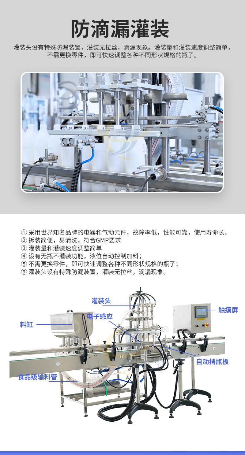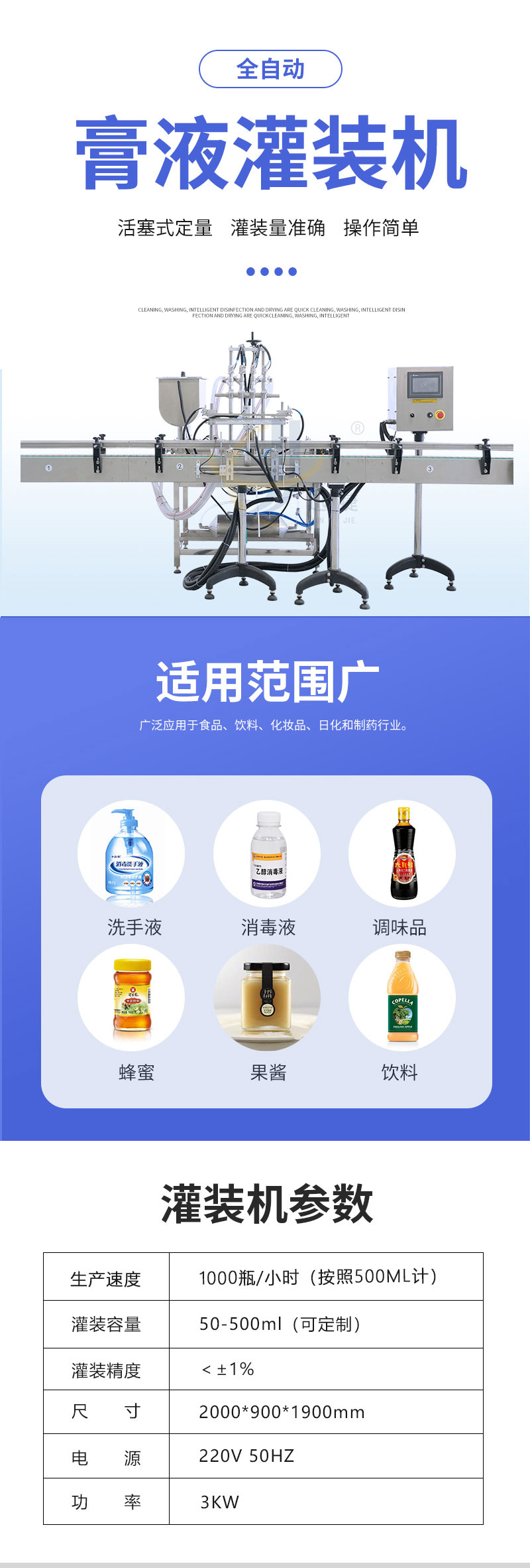 全自動膏液灌裝機適用于食品、飲料、化妝品、日化和制藥行業(yè)。灌裝頭設(shè)有特殊防漏裝置,灌裝無拉絲,滴漏現(xiàn)象。