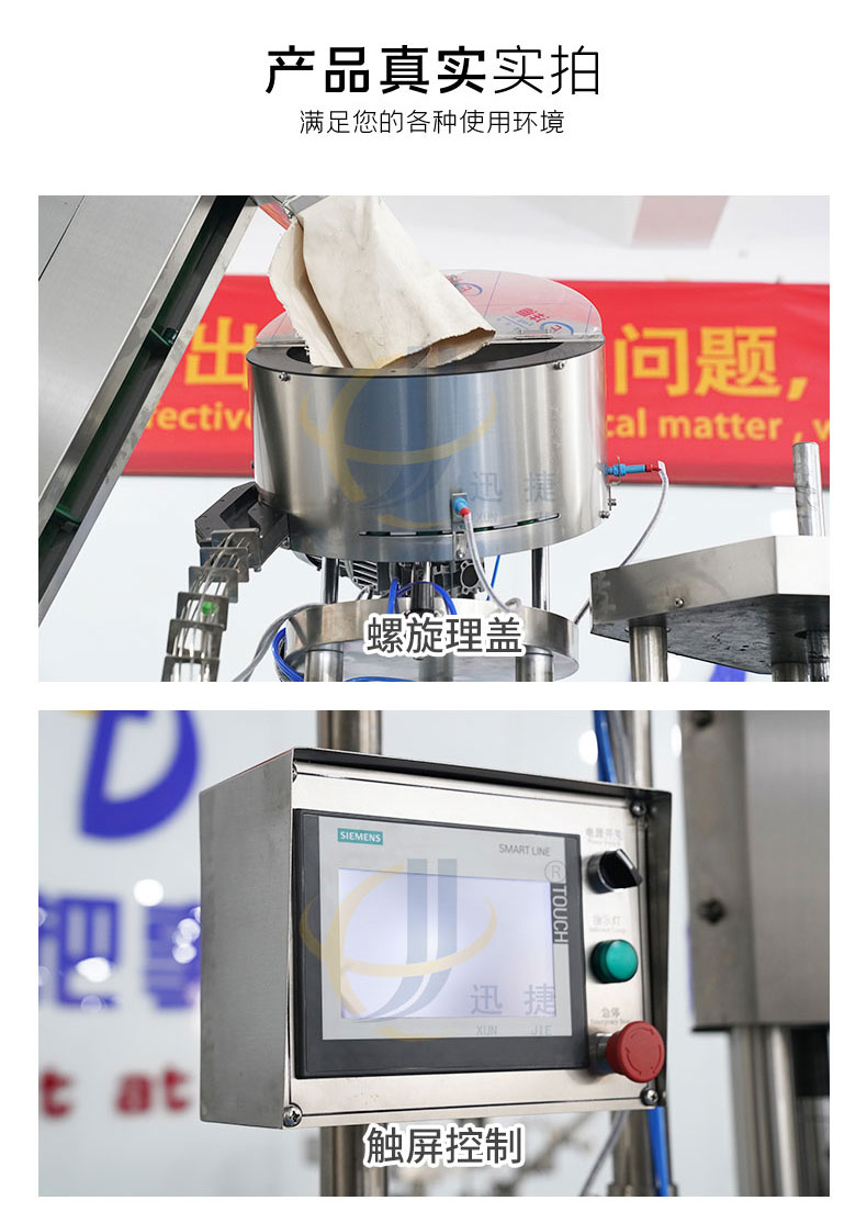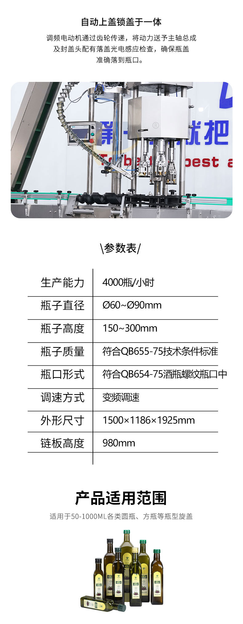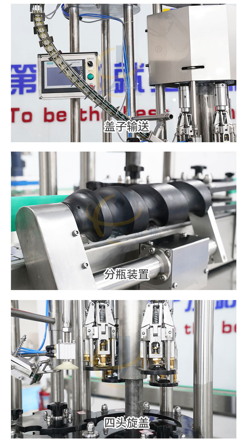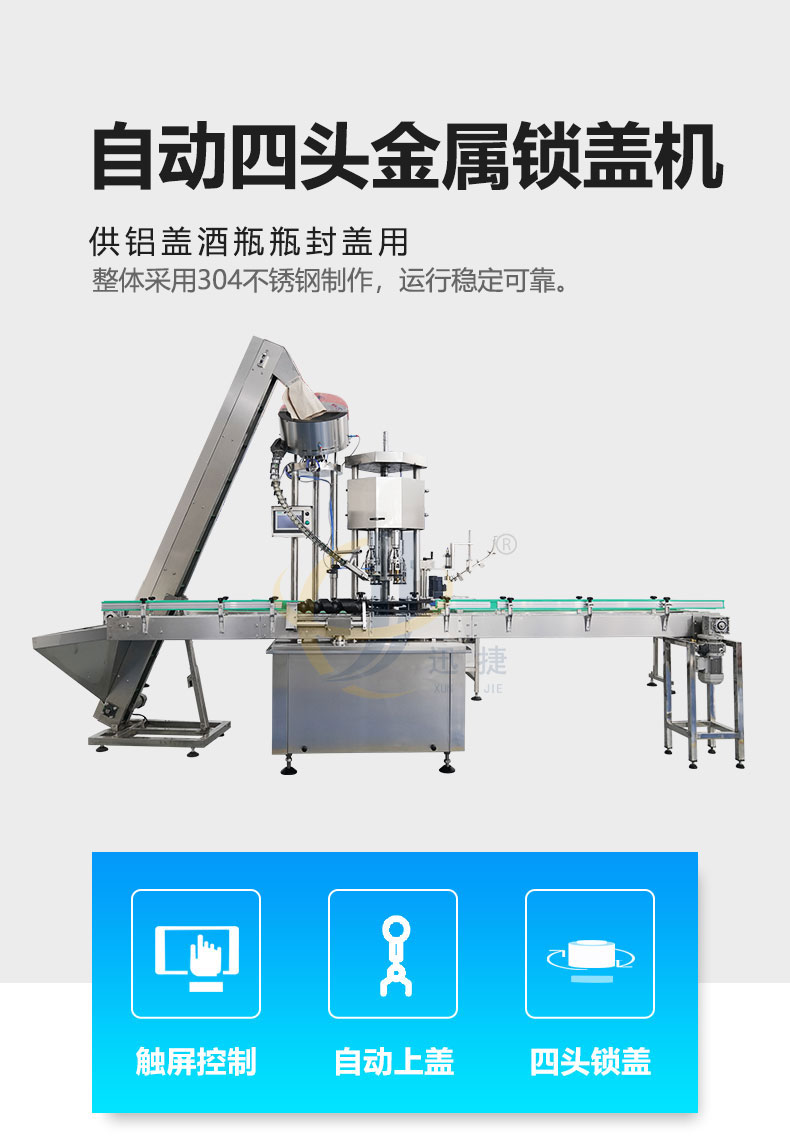 全自動四頭金屬鎖蓋機供鋁蓋酒瓶瓶封蓋用,整體采用304不銹鋼制作,運行穩(wěn)定可靠。適用于50-100ml各類圓瓶、方瓶等瓶型旋蓋。