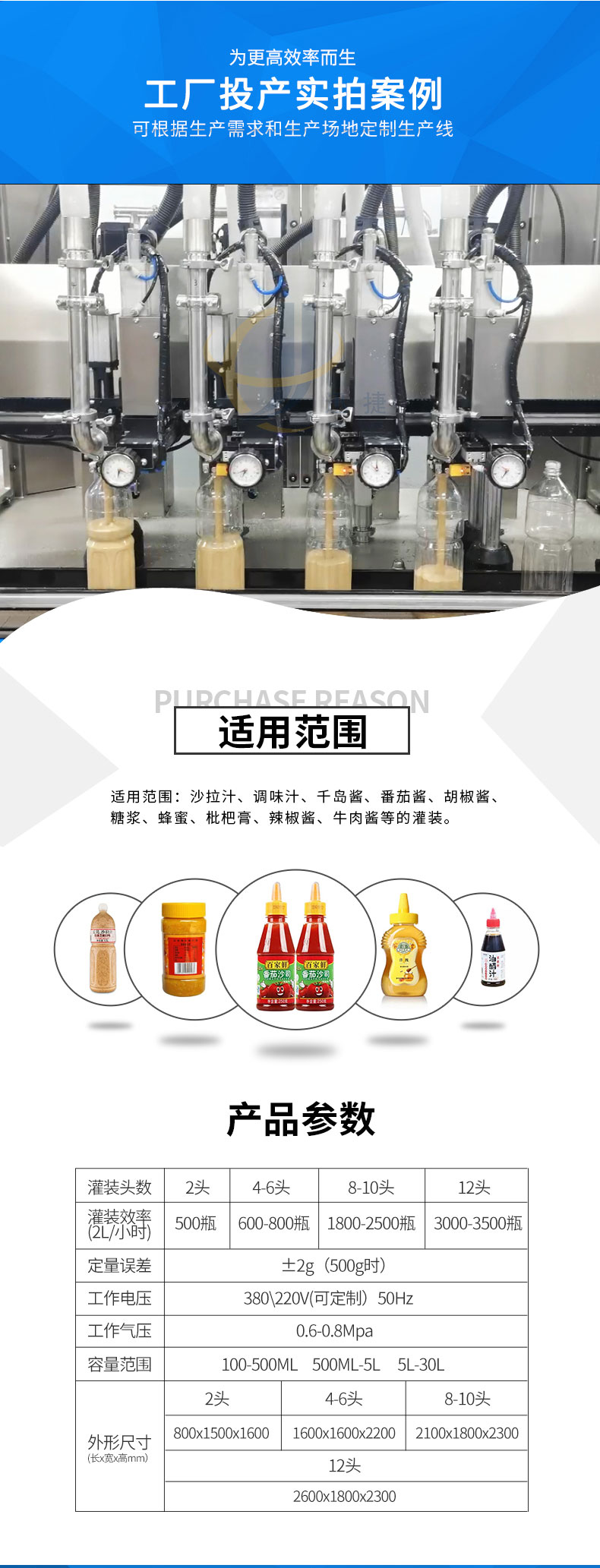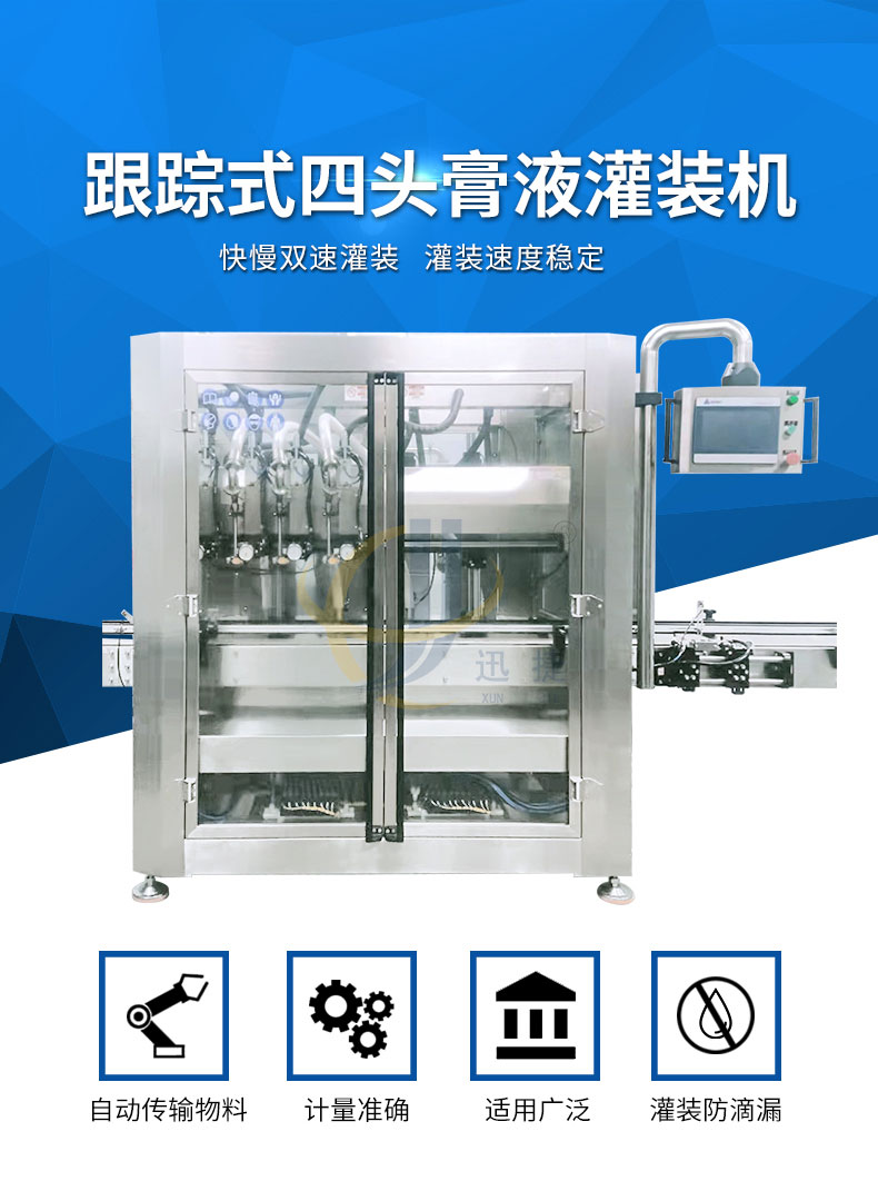 追蹤式膏液灌裝機(jī)適用范圍:沙拉汁、調(diào)味汁、千島醬、番茄醬、胡椒醬、糖漿、蜂蜜、枇杷膏、辣椒醬、牛肉醬等的灌裝。