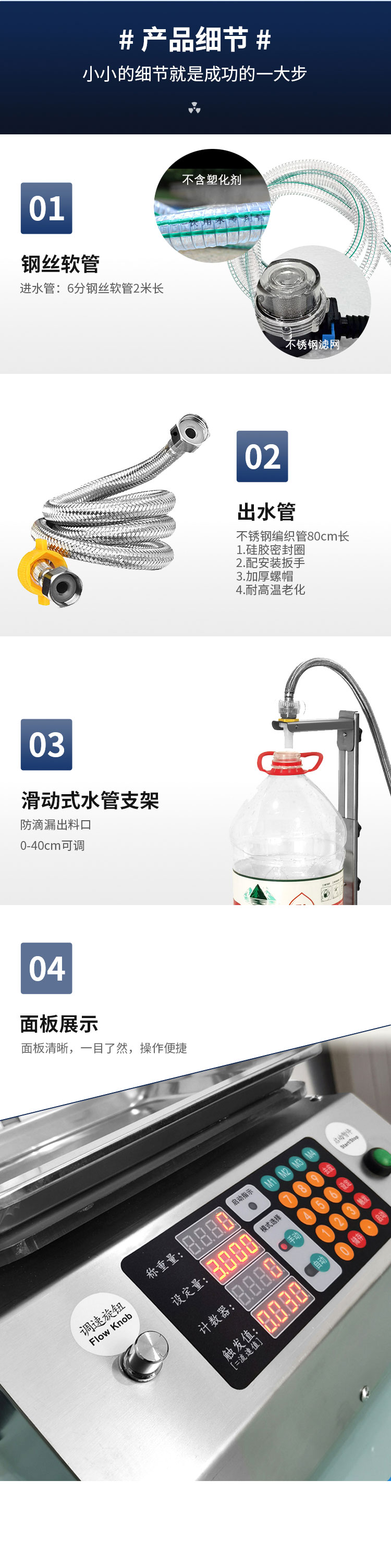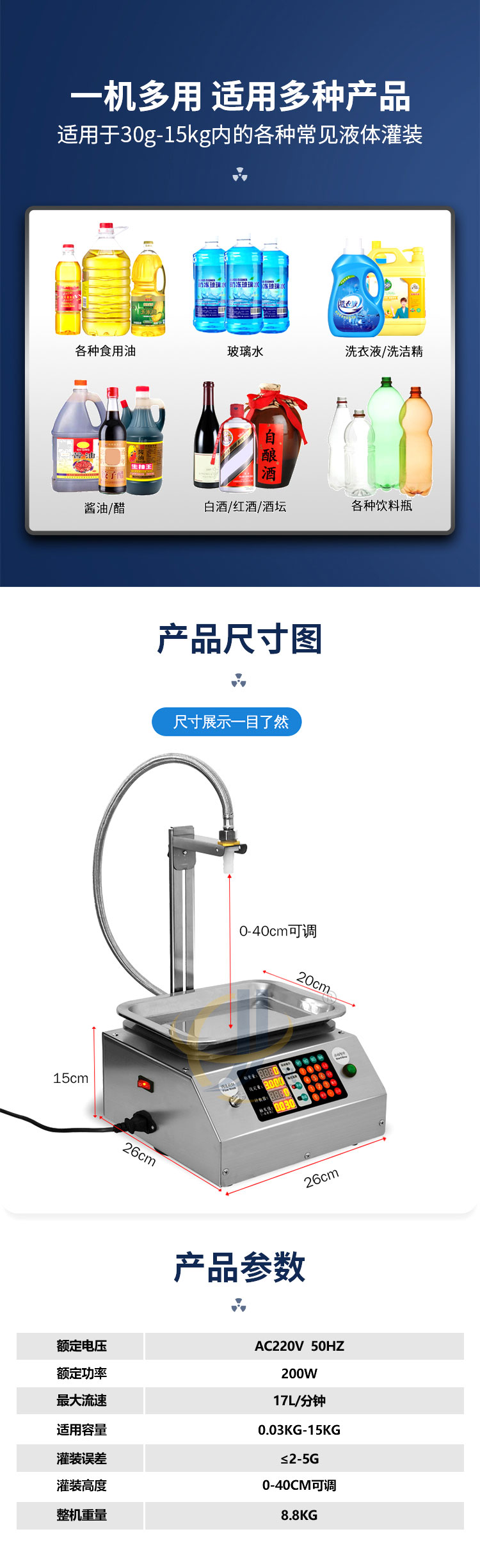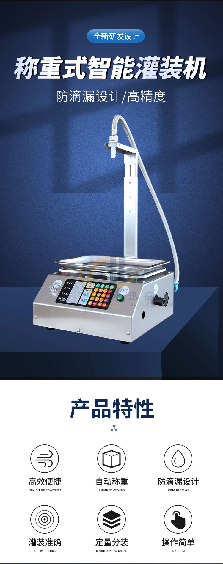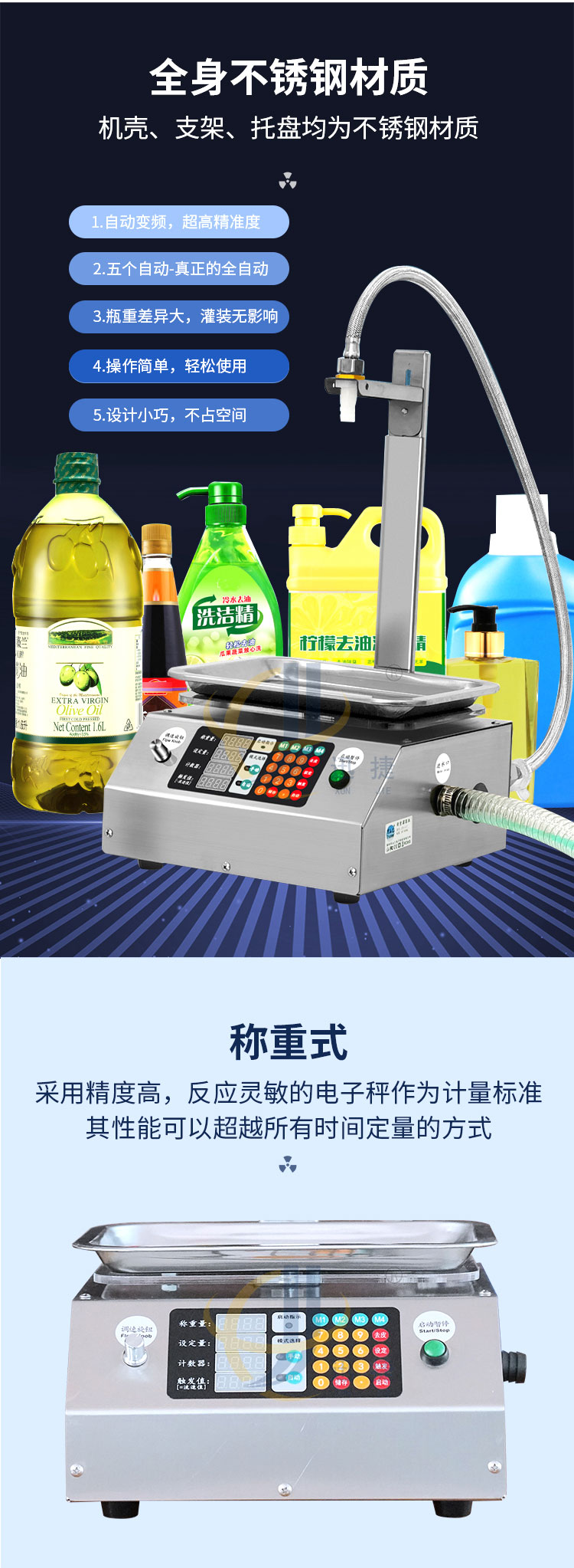 稱重式液體灌裝機(jī)適用于30g-15kg內(nèi)的各種常見液體灌裝。采用精度高,反應(yīng)靈敏的電子秤作為計量標(biāo)準(zhǔn)。其性能可以超越所有時間定量的方式。