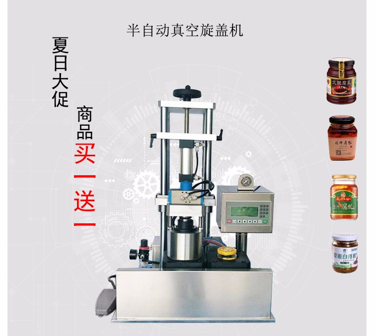 這款小型辣椒醬封口機主要用于食品包裝,采用標準馬口鐵爪式旋開蓋封口的玻璃瓶包裝??蓪崿F(xiàn)的功能是抽吸包裝容器內(nèi)的空氣使其達到設(shè)定的負壓值(即抽真空),然后旋緊蓋子。 為半自動機型,即人工進出瓶,人工配蓋,其他過程自動。
