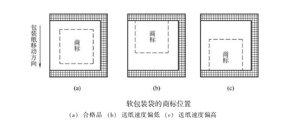 在包裝作業(yè)過程中,卷筒半徑逐漸減小,包裝紙所受張力發(fā)生變化,送紙輥與包裝紙之間的摩擦因數(shù)受環(huán)境溫濕度的影響而發(fā)生波動,加上商標印刷誤差,以及送紙、縱封、橫封、切斷各部分速度的差異等因素,使得刀輥的實際切線偏離規(guī)定部位。即使這種位置誤差很小,例如在某—包裝袋上只偏差0.1mm,但包裝機速度很快,有的高達200包/min, 如不加以控制調(diào)節(jié),機器運行1垃i六 后,誤差積累可達20mm,切線嚴重偏離規(guī)定部位,降低了包裝質(zhì)量,甚至造成廢品。如圖所示,圖(a)為合格品; 圖 (b) 為送紙速度偏低,商標后移; 圖 (c) 為送紙速度偏高, 商標前移。 為了保證包裝袋的正確封切, 必須在卷筒紙供送系統(tǒng)中, 引人商標圖案自動位置檢測與控制系統(tǒng)。目前應用廣泛的是光電自動定位系統(tǒng)。